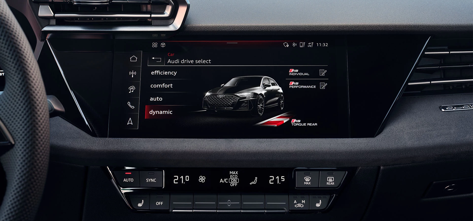 Audi drive select emphasises the dynamic side of the new Audi RS 3 Sedan. Activating any of the additional RS-specific driving modes – RS INDIVIDUAL, RS PERFORMANCE or RS TORQUE REAR – changes the vehicle characteristics in ways that are all about performance.