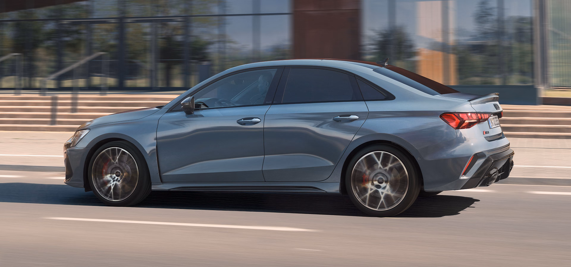 Sharpened proportions, RS design elements and expressive details. The new Audi RS 3 Sedan in the RS-specific paint finish Kemora grey, metallic.