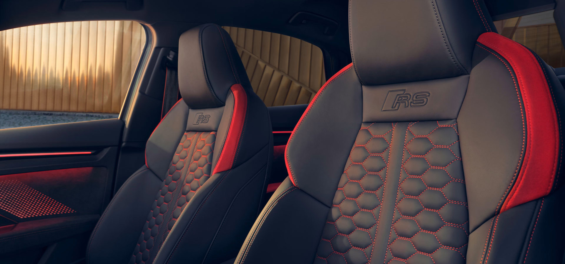 The sport seats, front in fine Nappa leather with honeycomb pattern, RS embossing and contrasting stitching in express red provide comfortable lateral restraint. The sporty look in the interior is harmoniously complemented by the backlit cloth section in the front doors with rhombus pattern – as a new design element of the ambient lighting package pro.