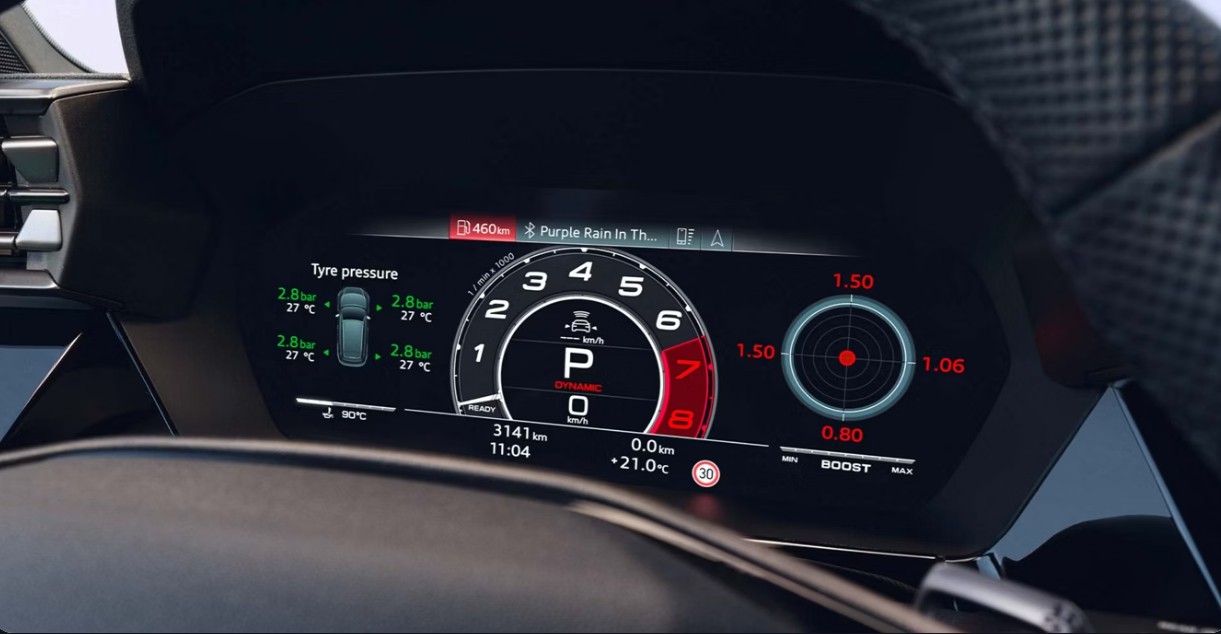 Enjoy sporty moments with the central tachometer of the Rev Counter design in the Audi virtual cockpit plus. The fully digital 12.3-inch instrument cluster also offers the instrument displays “Sport”, “Performance” and “Runway” and shows you relevant information.